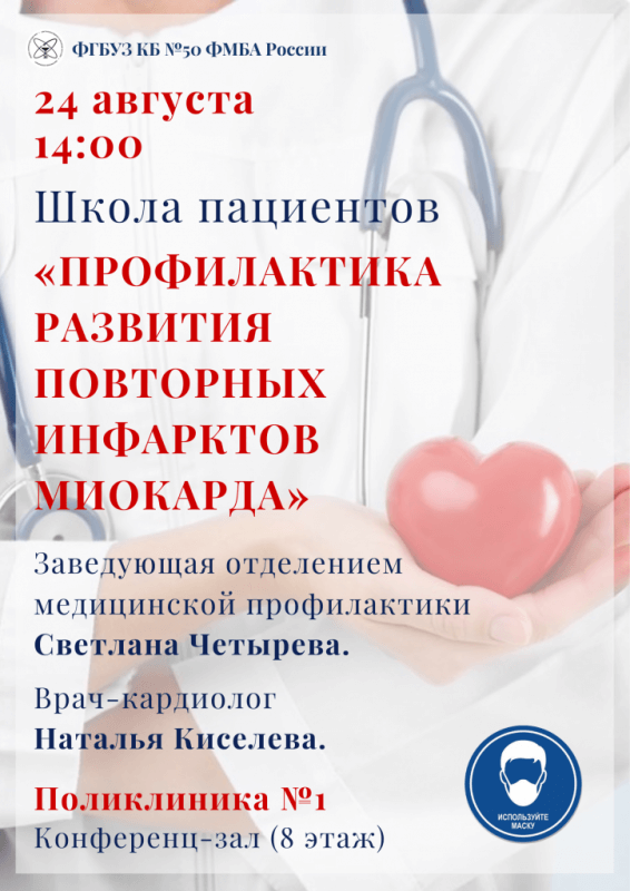 В среду, 24 августа, в первой поликлинике состоится занятие «Школы пациентов». Саровчанам расскажут о профилактике инфарктов миокарда у пациентов, ранее перенесших инфаркт.