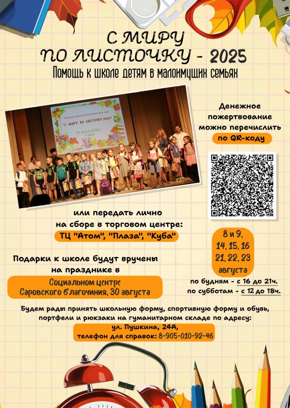 В Сарове началась благотворительная акция «С миру по листочку-2025». С 8 августа в торговых центрах волонтёры объединения «Радость моя!» собирают пожертвования для закупки канцелярских товаров и принадлежностей, чтобы помочь семьям в трудной жизненной ситуации собрать детей в школу.