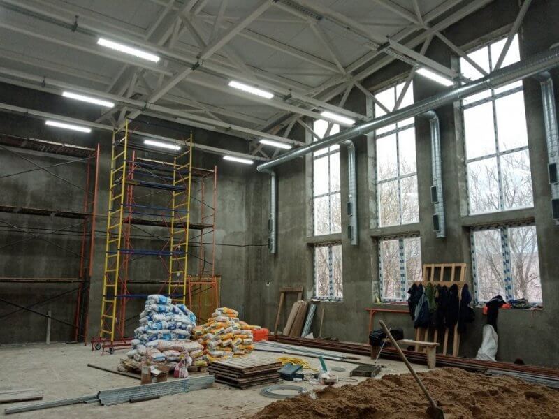 В самом спортзале сделаны освещение, электрика, система вентиляции. Работники приступают к установке отопительной системы.